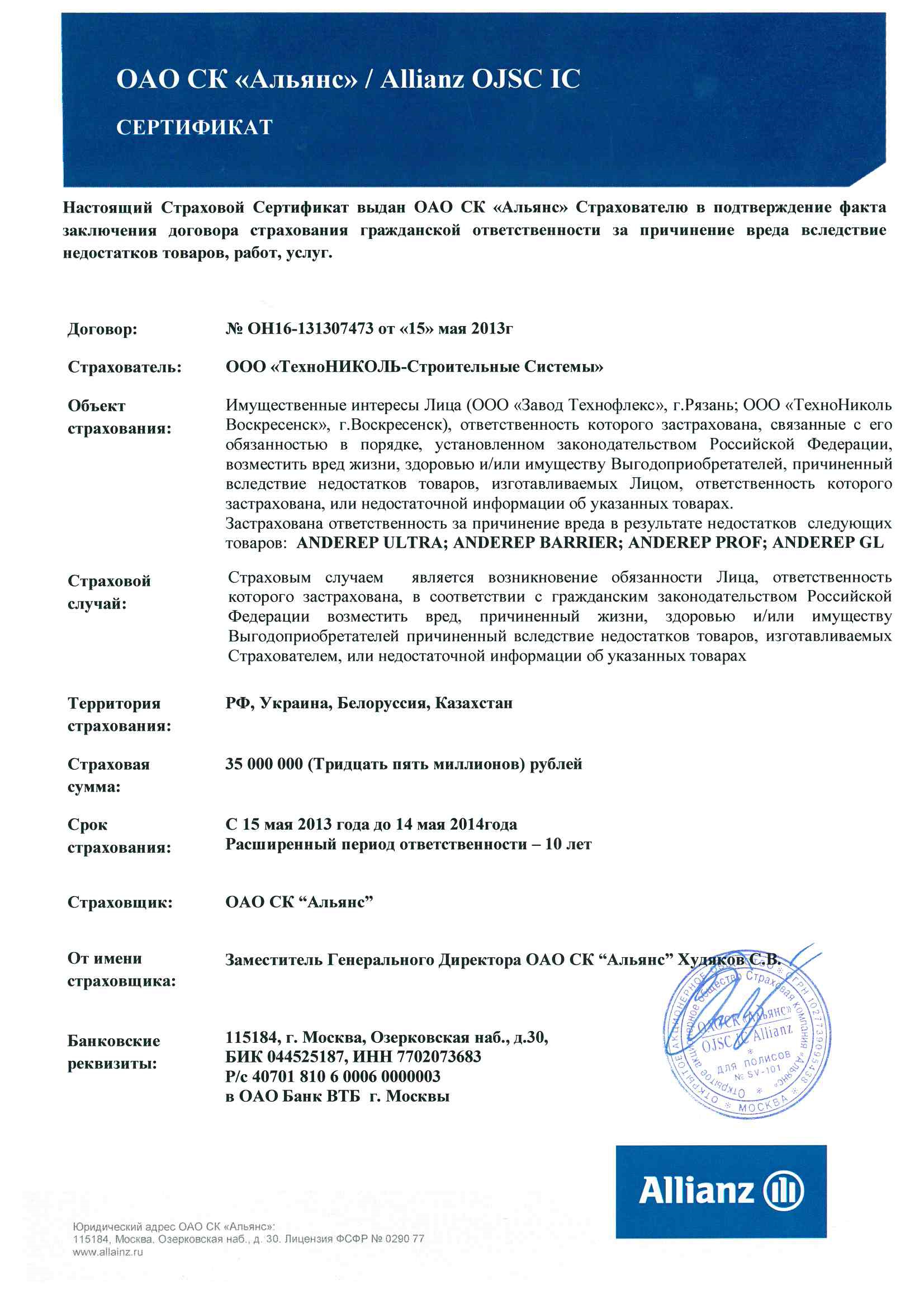 В мае этого года был продлен страховой полис, покрывающий риски клиента, при использовании подкладочных материалов ANDEREP. СК «Альянс» гарантирует компенсацию в размере 35 миллионов рублей, период страховой ответственности 10 лет!