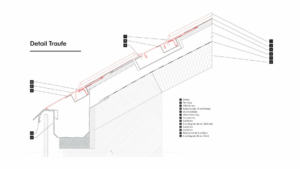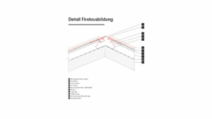 Комплекс спроектирован так, чтобы отражать как историческую виллу, так и окружающий горный силуэт. Крыша, покрытая австрийским алюминием PREFALZ в технике двойного фальца, особенно устойчива к экстремальным погодным условиям Альпийского региона. Основанием под фальц служит деревянная подконструкция со сплошным настилом 27 мм. После монтажа уровня обшивки плотником, произошла установка подложки и начальных планок вместе с соответствующими креплениями для перфорированных листовых покрытий. Впоследствии каждая отдельная поверхность крыши была точно размечена на месте, и был установлен соответствующий стандартный профиль. Стоячие фальцы проходят по нескольким кровельным поверхностям, создавая непрерывный, визуально однородный ландшафт кровли.
