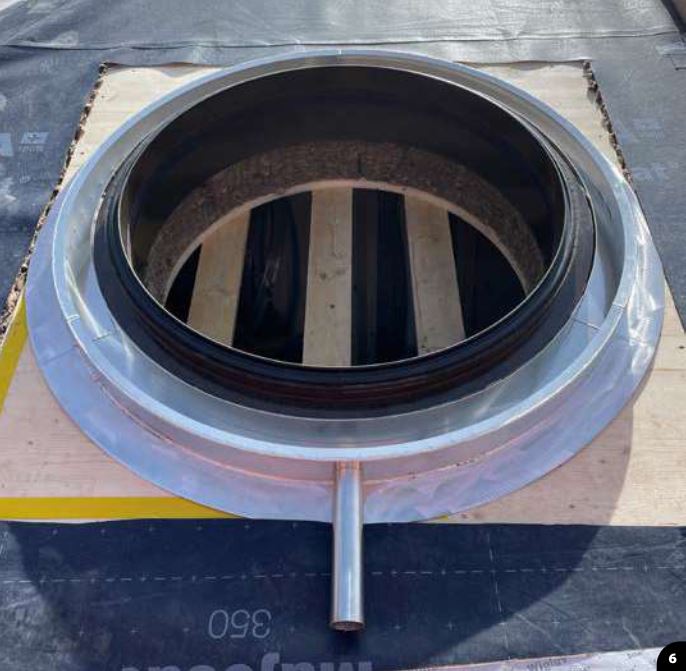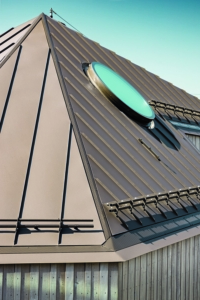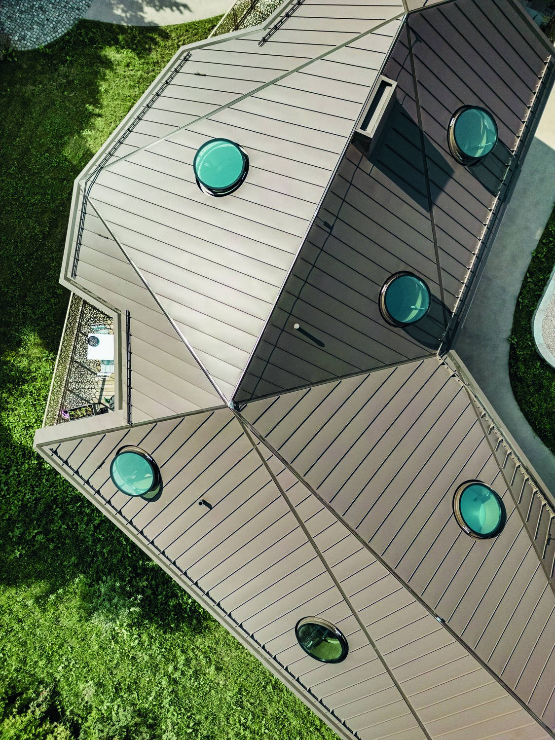 В общей сложности 45 мансардных окон диаметром 1,20 м каждое были установлены на кровельных поверхностях пяти зданий. Их точная интеграция в сложную геометрию поверхностей кровли потребовала индивидуального раскроя и детального планирования. Световые люки также отводят воду через скрытые желоба. Серьёзная задача была связана с также утопленной установкой круглых обрамлений мансардных окон.