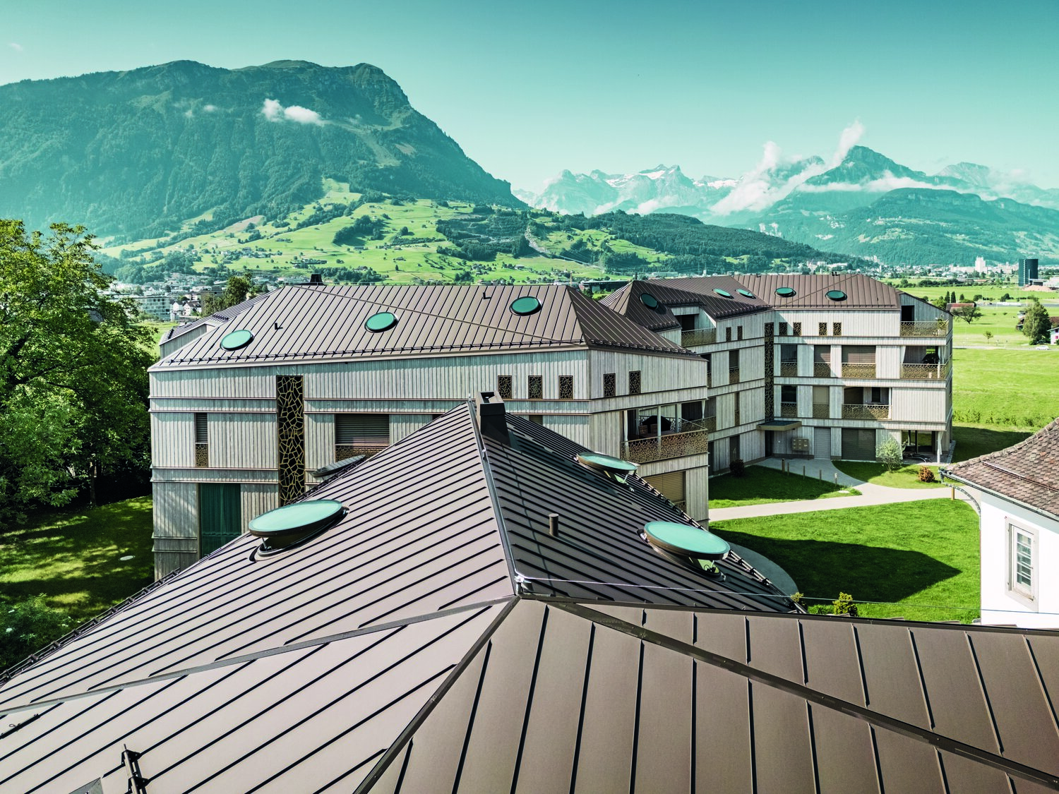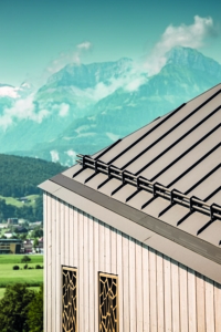 Комплекс спроектирован так, чтобы отражать как историческую виллу, так и окружающий горный силуэт. Крыша, покрытая австрийским алюминием PREFALZ в технике двойного фальца, особенно устойчива к экстремальным погодным условиям Альпийского региона. Основанием под фальц служит деревянная подконструкция со сплошным настилом 27 мм. После монтажа уровня обшивки плотником, произошла установка подложки и начальных планок вместе с соответствующими креплениями для перфорированных листовых покрытий. Впоследствии каждая отдельная поверхность крыши была точно размечена на месте, и был установлен соответствующий стандартный профиль. Стоячие фальцы проходят по нескольким кровельным поверхностям, создавая непрерывный, визуально однородный ландшафт кровли.