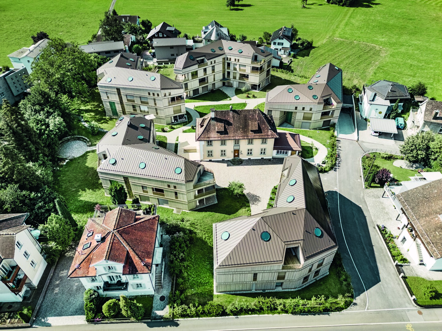 «На первый взгляд пять многоквартирных домов выглядят почти одинаково», — объясняет мастер Шпенглер Грегор Блесс из одноимённой компании. При ближайшем рассмотрении становятся очевидны определённые различия: многочисленные квартиры имеют индивидуальные планы этажей, поэтому дизайн объёмов и соответствующих крыш отличается друг от друга.