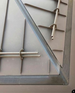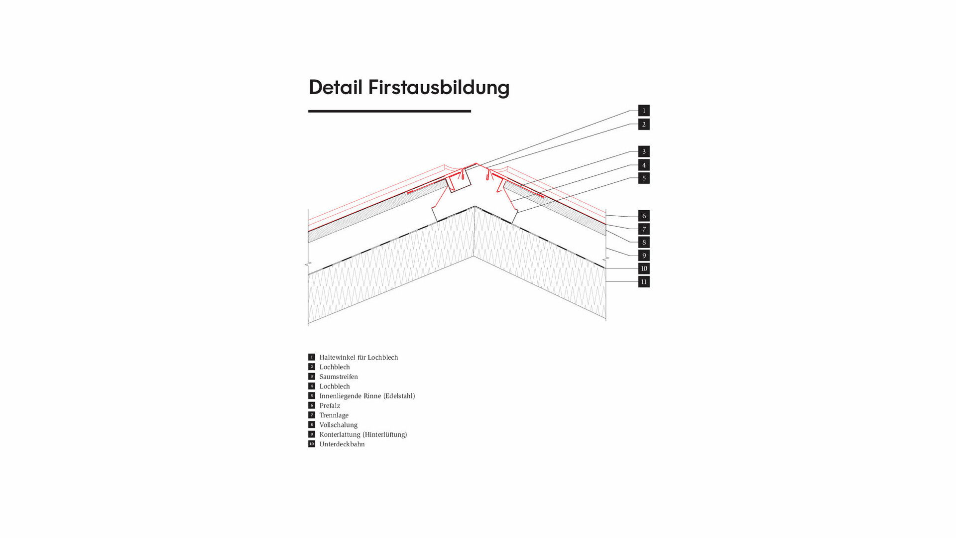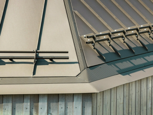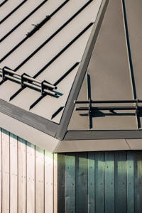 Особенностью конструкции крыши являются утопленные кровельные швы, разжелобки, соединения хребтов и формирования коньков. Мастера установили специальные профили желобов из нержавеющей стали примерно на половине строительной высоты или на половине уровня вентиляции. Когда все отрицательно сформированные разжелобки, хребты, кровельные швы, карнизные желоба и коньки были выполнены, для их закрытия кровельщики использовали перфорированные листы с квадратным отверстием 5 на 5 мм. В соответствии с цветовым оформлением металлической крыши перфорированные профили были покрыты порошковой краской.