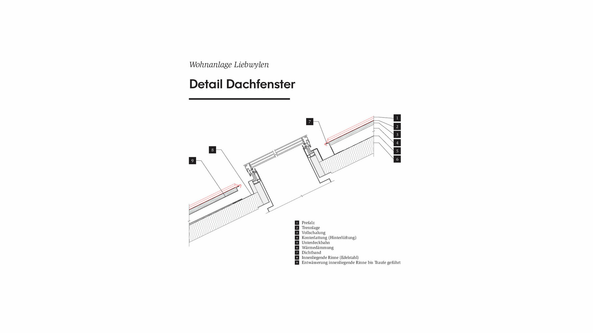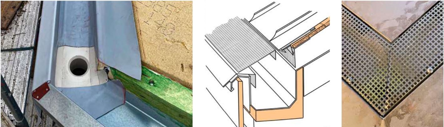 Карнизный желоб состоит из оцинкованного несущего профиля. Его герметизация была выполнена с помощью однородно сваренной мембраны. Из-за сложной планировки крыши коробчатый желоб почти нигде не проходит горизонтально. Вместо этого направление стока воды поднимается и опускается аналогично ходу краёв крыши. Вместо обычных деталей из листового металла, внутренние водоотводные каналы были организованы по карнизам, рёбрам, ендовам и конькам и закрыты заподлицо с кровельным покрытием перфорированным листом в цвет крыши, чтобы обеспечить однородный, плоский вид. Для этого было окрашено и установлено 1600 дополнительных угловых профилей.
