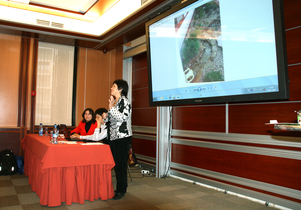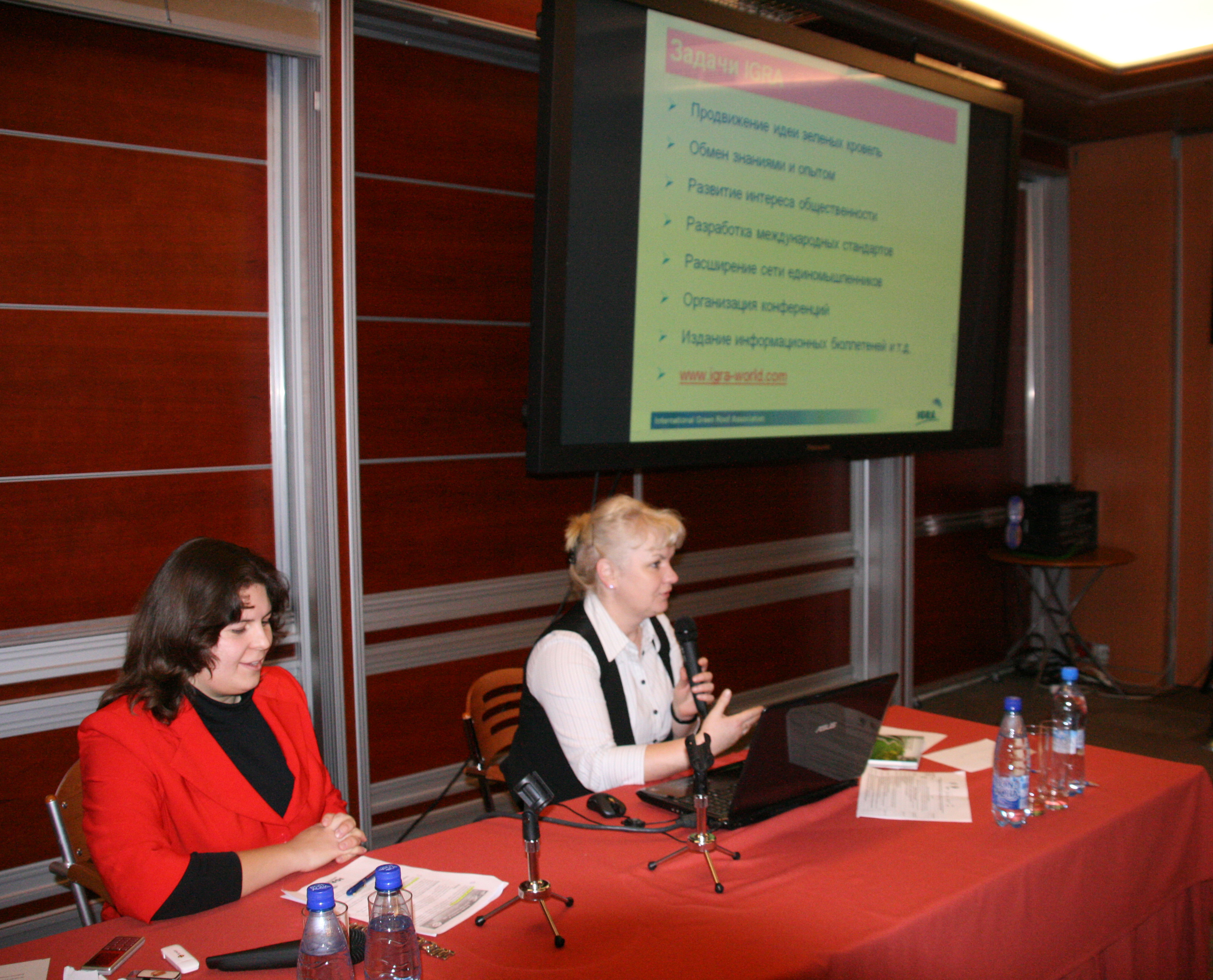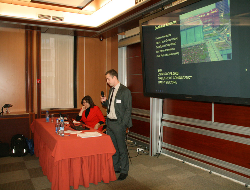 Ирина Воробьева зачитывает приветственное слово директора Международной ассоциации зеленых кровель IGRA Вольфганга АнселяКонстантин Егоров, студент университета «Оксфорд Брукс», изучающий строительный менеджмент и готовящий диссертацию на тему глобализации применения «зелёных» крыш, выступил с докладом о пользе зелёных крыш и рассказал об успешных проектах в Британии, Польше и других странах. Участие Константина в работе семинара спонсировали Европейская Федерация Ассоциаций Зелёных Крыш (EFB) и информационный портал livingroofs.com в лице Дасти Геджа и Гари Гранта, а так же главный редактор и издатель польского журнала Dachy Zielone (электронный журнал о зелёных крышах) Ева Пятек-Козучёвска.