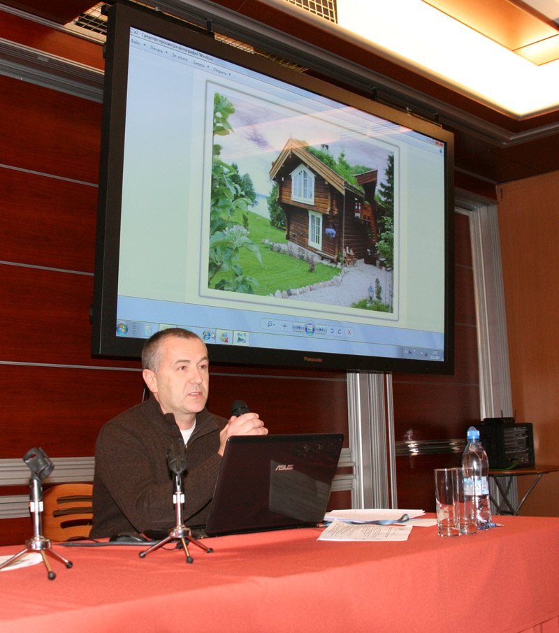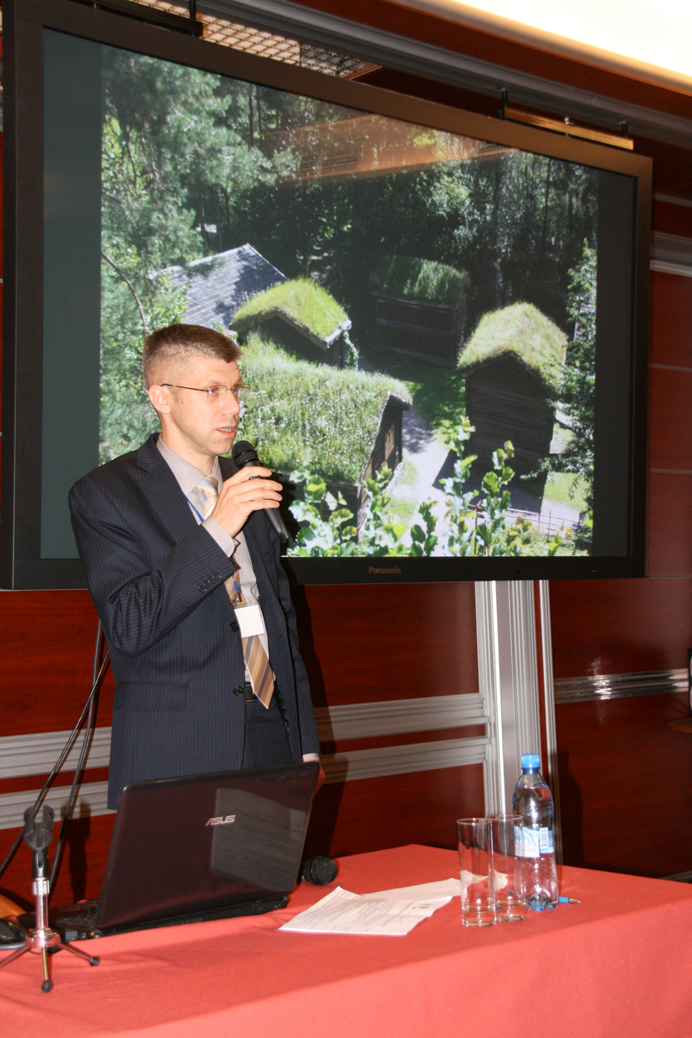 Выступление Константина ЕгороваК сожалению, большинство заказчиков, девелоперов и архитекторов боятся возводить зеленые кровли, поскольку считается, что в нашей стране для этого слишком холодный климат. Поэтому редакция журнала «Кровли» попросили рассказать об опыте строительства деревянных домов с зелеными кровлями в Норвегии и Литве, где никак не жарче чем в ряде регионов России, Ивана Тирского, представителя интернациональной компании «Logtechgroup». За годы работы компания «Logtechgroup» построила не один десяток экологически безопасных и красивых деревянных домов с зелеными кровлями в Европе, а в этом году успешно вышла и на российский рынок.