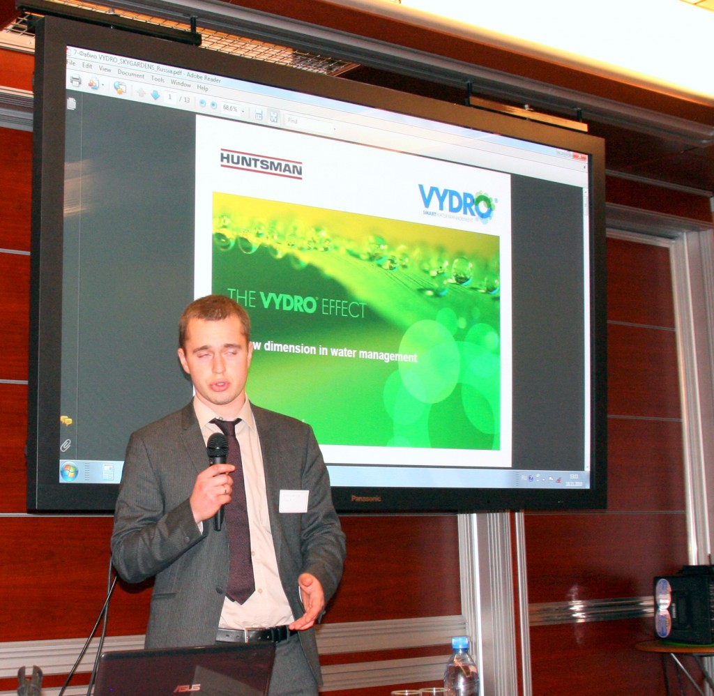 Конструкция зеленой кровли требует особого подходы к выбору теплоизоляцииОт имени коммерческого стратегического менеджера компании Huntsman Фабио Инверницци (Fabio Invernizzi), об инновационном материале Vydro для применения на «зеленых» кровлях рассказал Константин Егоров. Материал Vydro впитывает большое количество влаги, предотвращая переувлажнение зеленой кровли, с одной стороны, и пересыхание растений, — с другой.