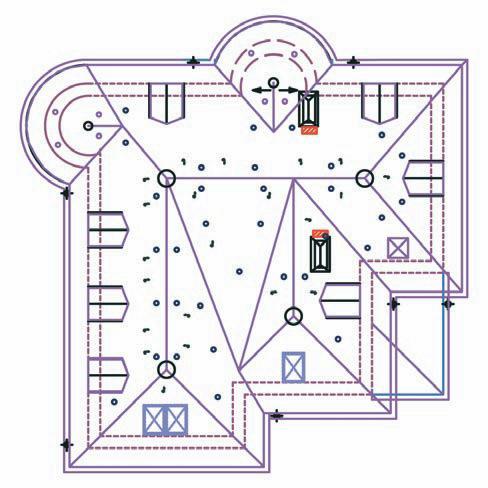 Задача. Автор этого проекта затрудняется с принятием решения по организации освещения мансардного этажа, поскольку его концепция предусматривает устройство со стороны двух фасадов только слуховых окон. Мансарда состоит из четырех помещений. Их необходимо осветить, используя заложенные в проект архитектором слуховые окна, добавив к ним мансардные окна.