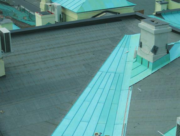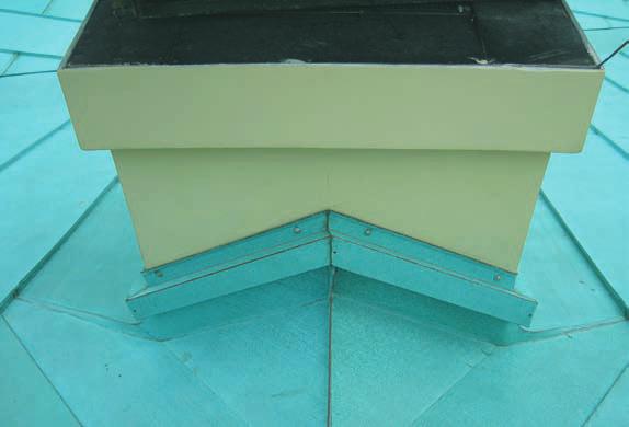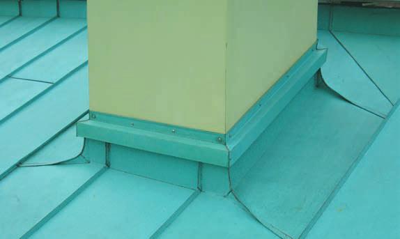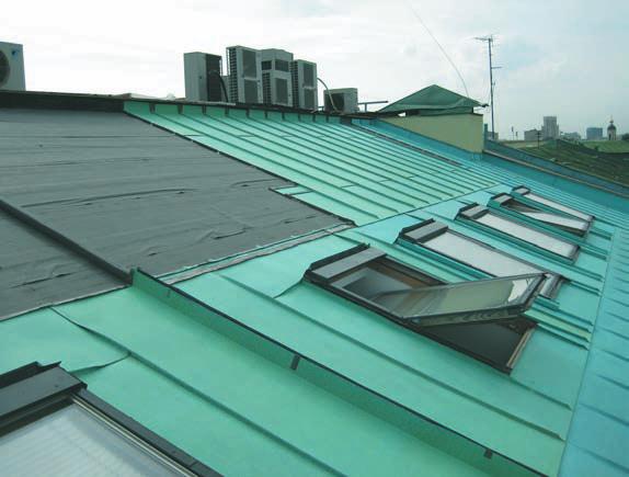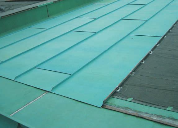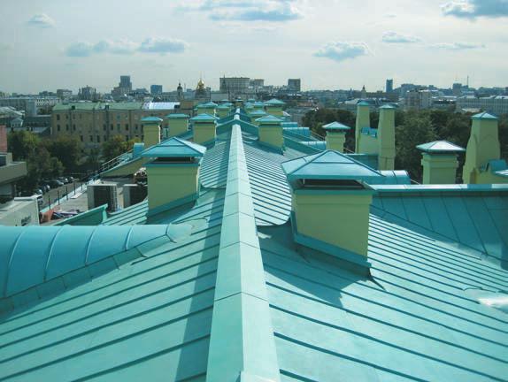 горизонтальных швов ниже и выше мансардных окон, а также при устройстве сложных ендов. Такое техническое решение было необходимо в связи с малыми уклонами кровли (около 20%).