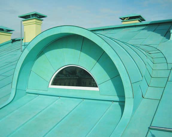 Окна арочной формы также выполнены вертикальным двойным фальцем, а сопряжение с ендовой вокруг окна выполнено с перехлестом и зацепом радиусных картин за припаянную планку.
