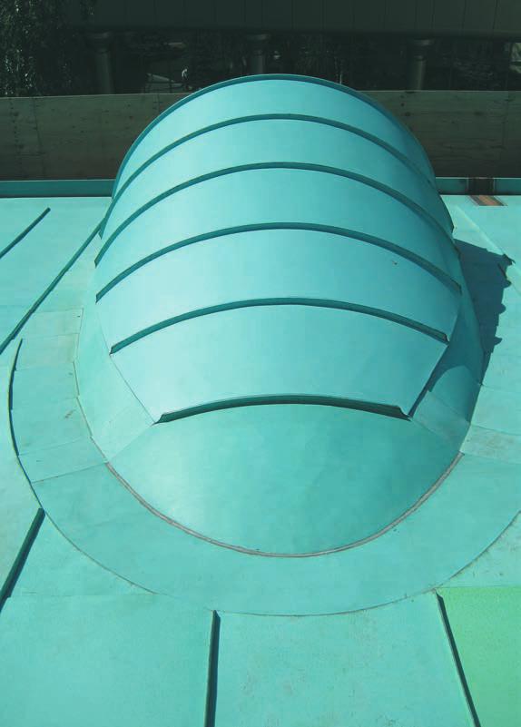 По скату крепление также выполнено с перехлестом и применением уплотнительной пористой ленты. Верхний элемент сопряжения со скатом изготовлен из двух отдельных заготовок по определенной технологии с применением пайки. К той части, которая ляжет на скат, будет припаиваться медная планка по радиусу, параллельно пропаянному шву, получившемуся при изготовлении этого элемента, также для устройства перехлеста при выполнении радиусного лежачего фальца.