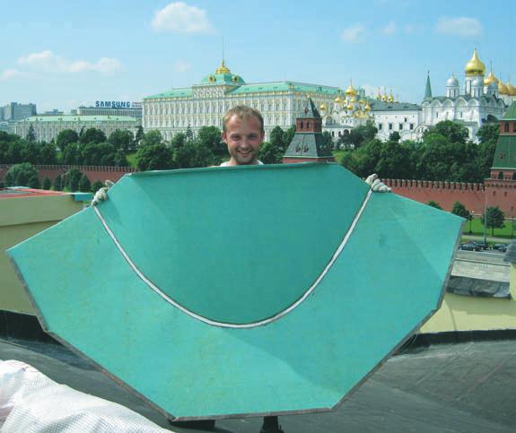 Купол заслуживает отдельного рассказа. Уже одно то, что он хорошо виден и из Кремля, и со смотровой площадки моста ниже Васильевского спуска, и с Кремлевской набережной, ко многому обязывает. Но настоящие мастера работают с одинаково высоким качеством хоть в центре Москвы, хоть в глухой деревеньке где-то в провинции. Изготовление кровельных элементов в виде объемных ромбов выполнялось на специальном гибочном станке «Эдельвейс», который был разработан и запатентован при участии ведущих мастеров компании «Саврос». Его конструкция позволяет изготавливать объемные ромбы с четкими гранями, переменными размерами и углами. Специальная система раскроя заготовок позволила при монтаже располагать ромбы по одной спиральной линии без перехлестов на нижерасположенные ряды. Фальцевая скрытая система крепления ромбов обеспечивает герметичность и надежность купола не менее чем на сто лет.