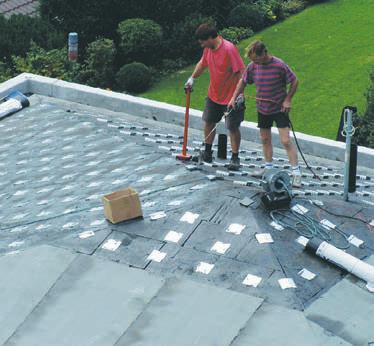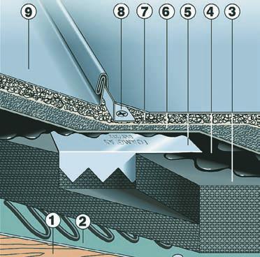 Пеностекло FOAMGLAS ® марки Т4+ (один или два слоя). Пеностекло приклеивается к основанию сплошным слоем, образуя единую систему с тремя функциями: пароизоляция, теплоизоляция и гидроизоляция (на случай протечек). Зубчатая пластина, приклеенная к пеностеклу, служит основанием для крепления кляммеров.