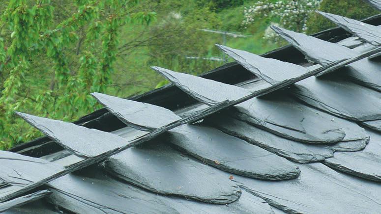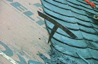 Молоток. Длинная заостренная поверхность молотка служит для подрубки пластин кровельного сланца. Подрубка необходима, поскольку края плитки после обработки имеют характерную для заводской обработки фактуру. Использовать электрический режущий инструмент по камню или болгарку для этих целей нельзя. Заостренным концом молотка пробиваются отверстия для крепежа сланца гвоздями. Пробитое молотком отверстие имеет форму конуса, что уменьшает вероятность повреждения плитки шляпкой кровельного гвоздя.