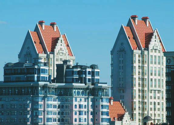 Архитектура жилого комплекса передает самые выразительные черты городов Северной Европы -готические фасады, стрельчатые витражи и остроконечные башни. Яркая архитектурная деталь комплекса - цветная керамическая черепица. Это нестандартное архитектурное решение для дома такой этажности (22 этажа, высота в коньке - 110 м). Скатные крыши - вообще явление нехарактерное для таких многоэтажных домов.
