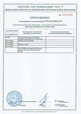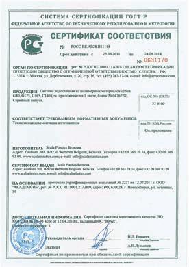 характеристики и свойства водосточной системы ScalaPlastics были проверены путем лабораторных тестов, проведенных компанией Серконс – российским бюро сертификации. На основании результатов испытаний водосточных систем ScalaPlastics был выдан Российский сертификат соответствия.